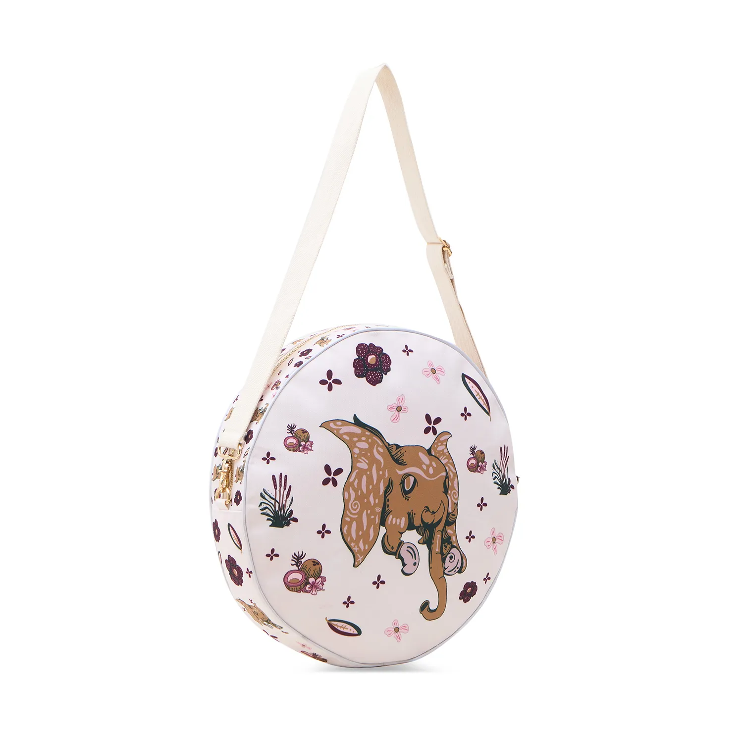 Tas berbentuk lingkaran sempurna ini bukan sekadar aksesori; ini adalah 'Wearable Art' yang menceritakan kisah. Ilustrasi gajah cokelat yang artistik dikelilingi oleh motif bunga Rafflesia dan tanaman tropis, dicetak penuh di atas kanvas berkualitas premium. Setiap detail mencerminkan kejujuran ekspresi dan imajinasi liar seorang seniman autistik.