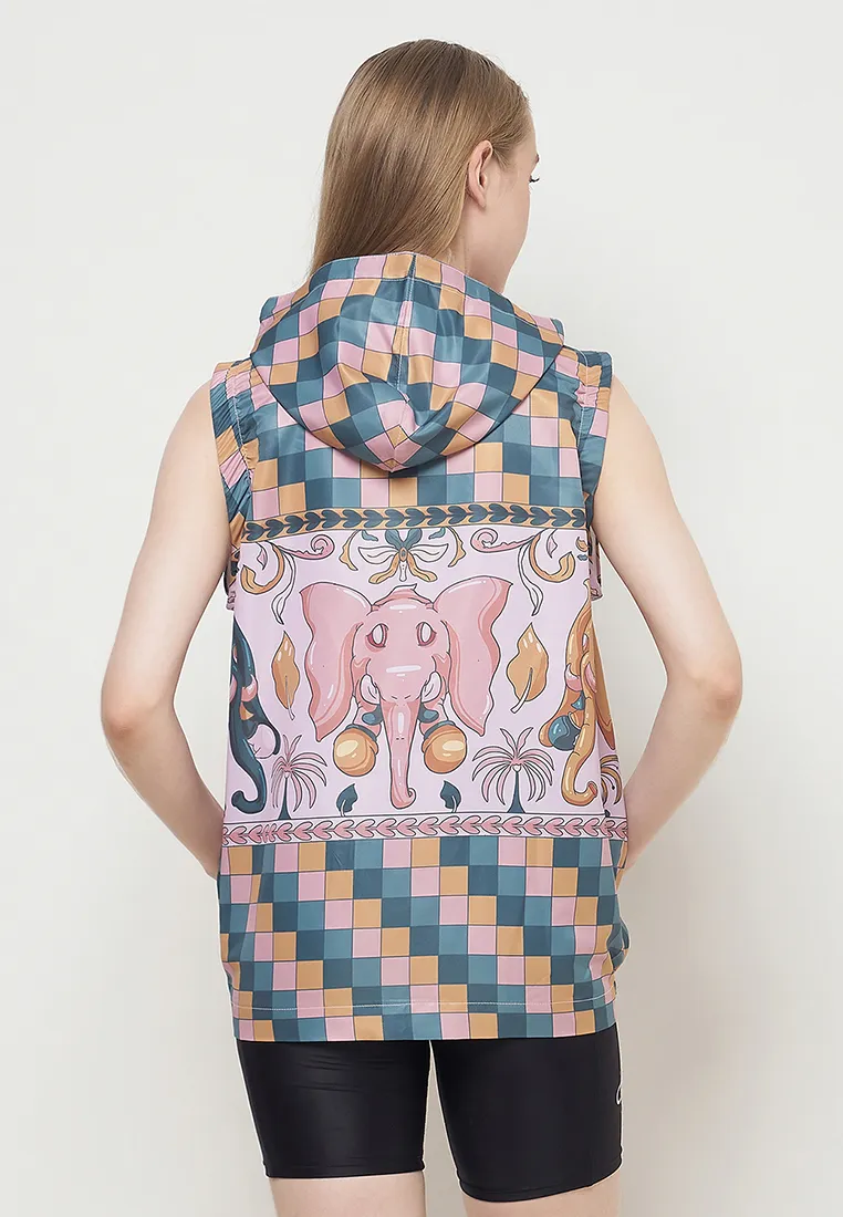 Rompi sporty ini dirancang untuk Anda yang aktif dan mencintai gaya layering. Ilustrasi gajah yang penuh warna (pink, teal, mustard) berpadu harmonis dengan pola papan catur retro, menciptakan tampilan